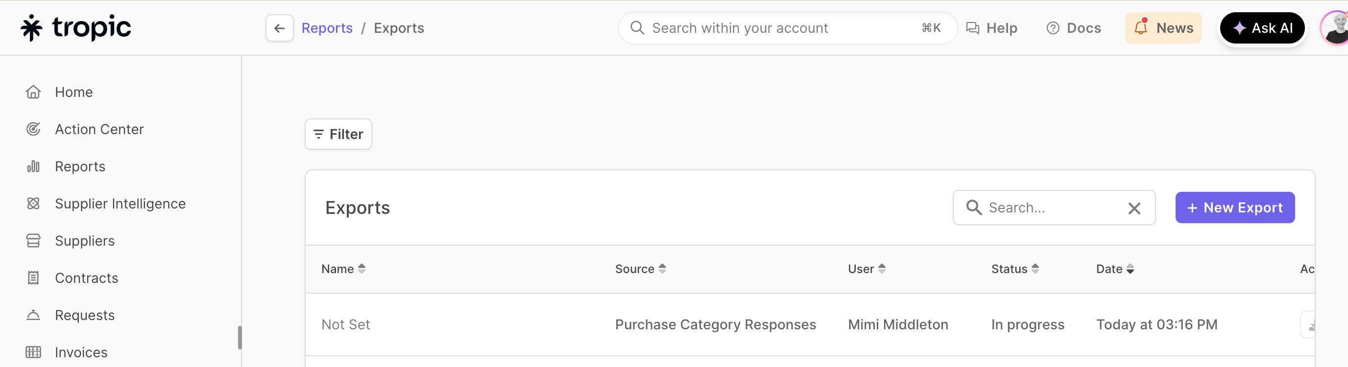 Tropic routes you to Reports → Exports, where the export runs immediately and appears in the list under the source Purchase Category Responses. Click Download to save the file as a CSV.