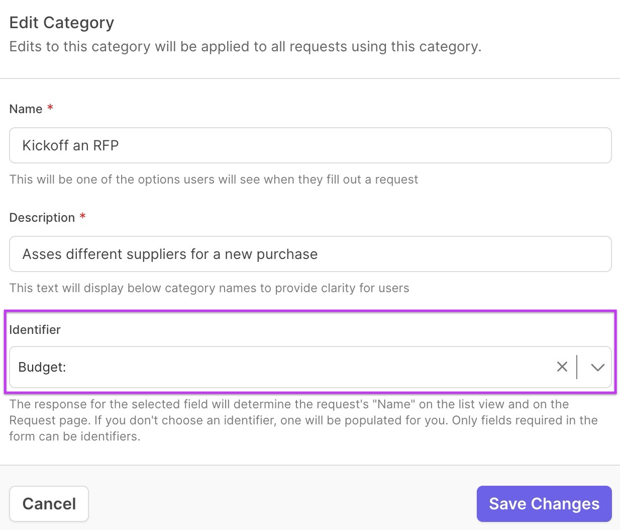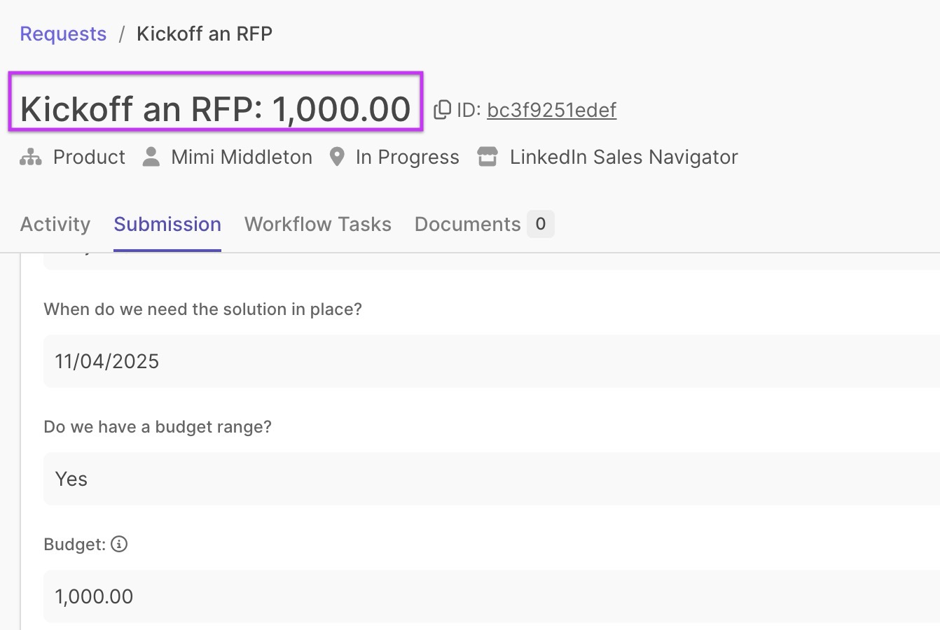 For example, if you select the Budget field as the Identifier and someone enters “1,000.00” when submitting the form, the request title will display as Kickoff an RFP: 1,000.00.