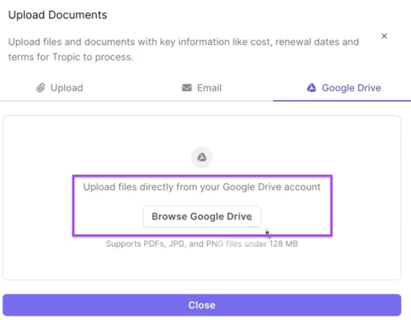You can add documents by uploading them in Tropic, importing them from Google Drive, or forwarding them from your inbox.