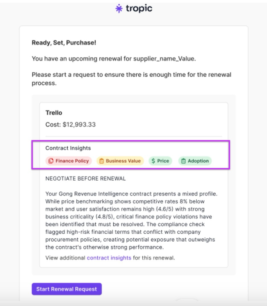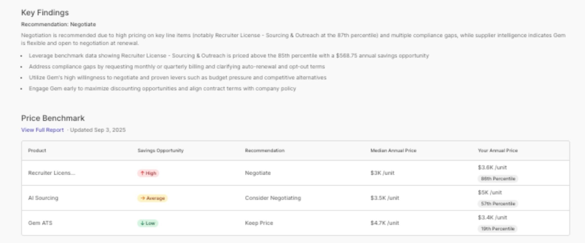 - Key Findings: Gives your team a clear recommendation, so you can glance at a contract and know exactly what needs to be addressed, whether to renew, negotiate, or cancel.