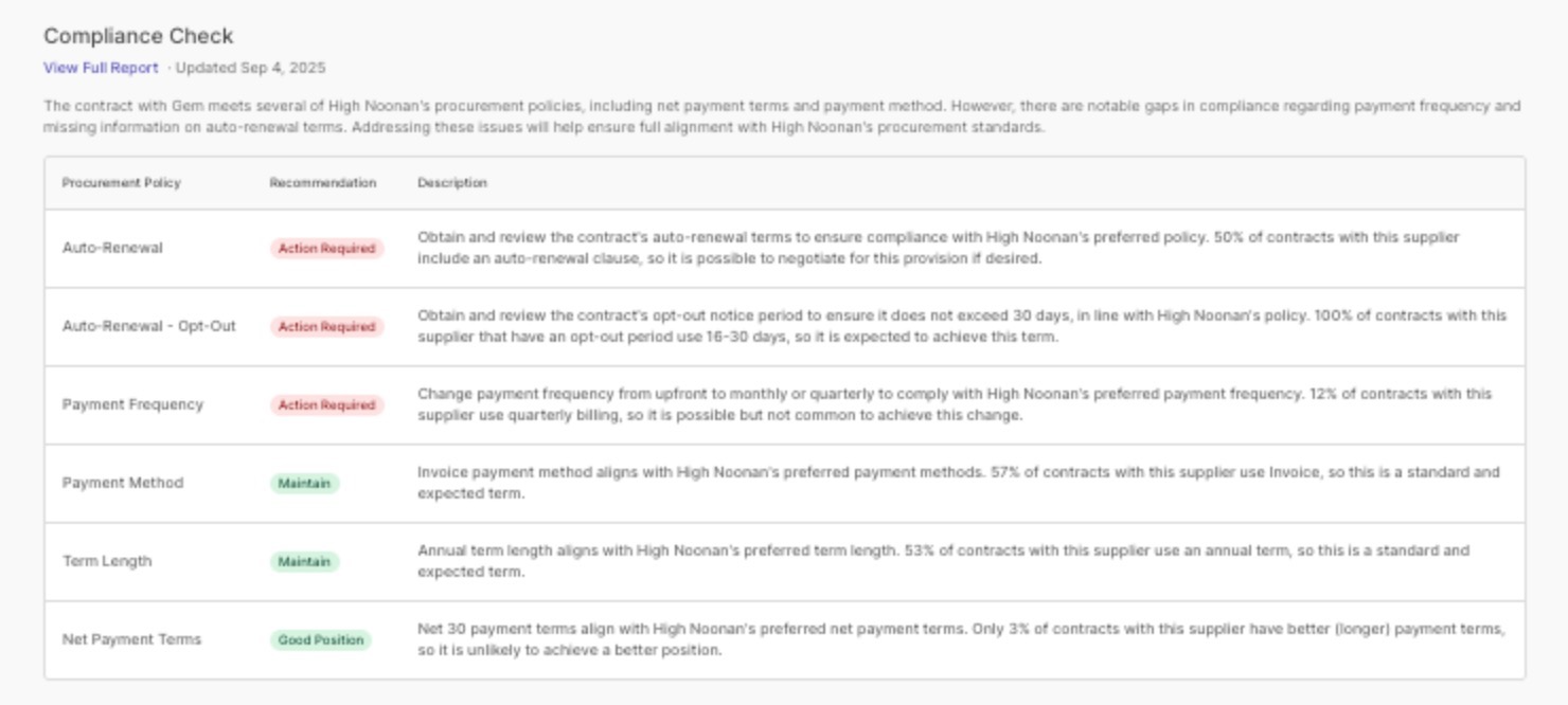- Compliance Check: Flags where your contract terms don’t align with your policies (like auto-renewals, payment frequency, or uplift clauses) so you know exactly what needs to change and what’s already in good shape.