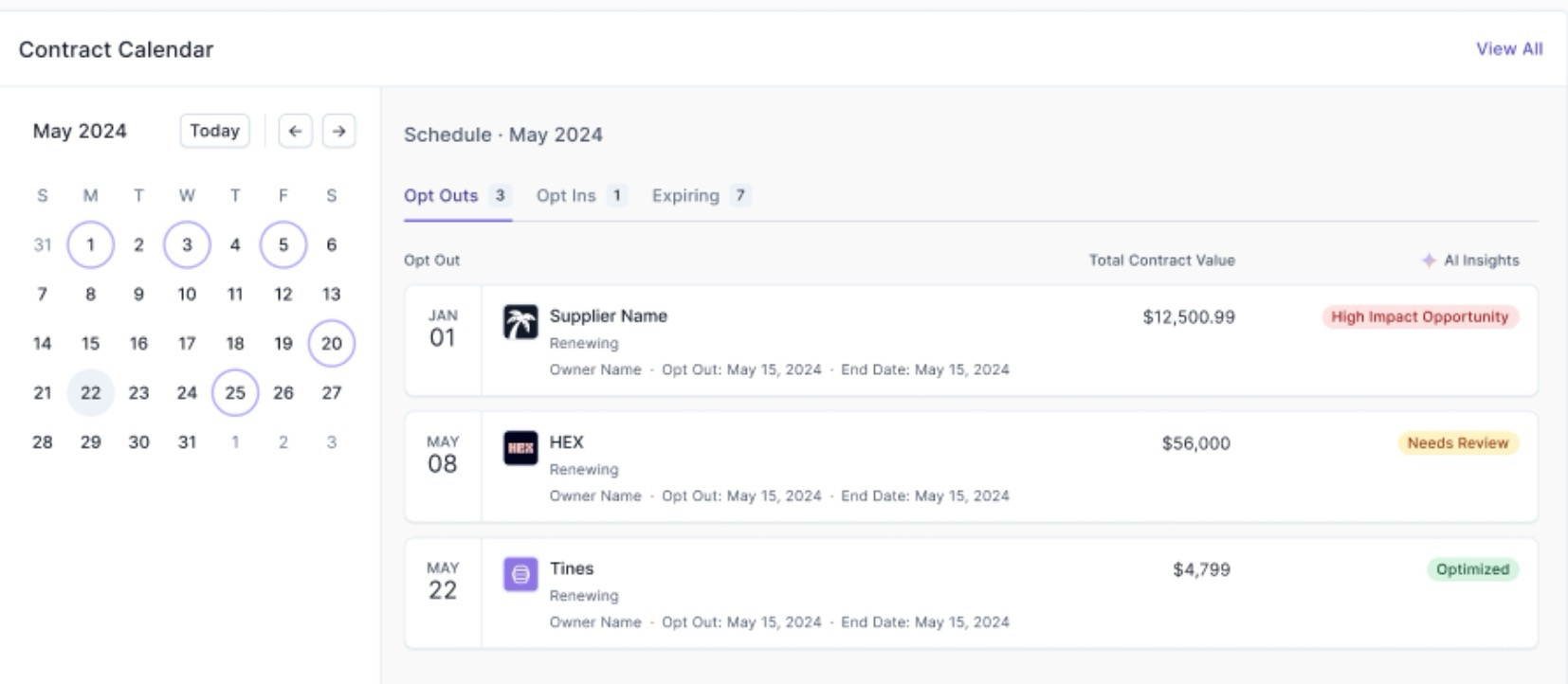 The Contract Calendar on your homepage highlights upcoming renewals with insights. You can quickly see which contracts are high impact, which need review, and which are already optimized.