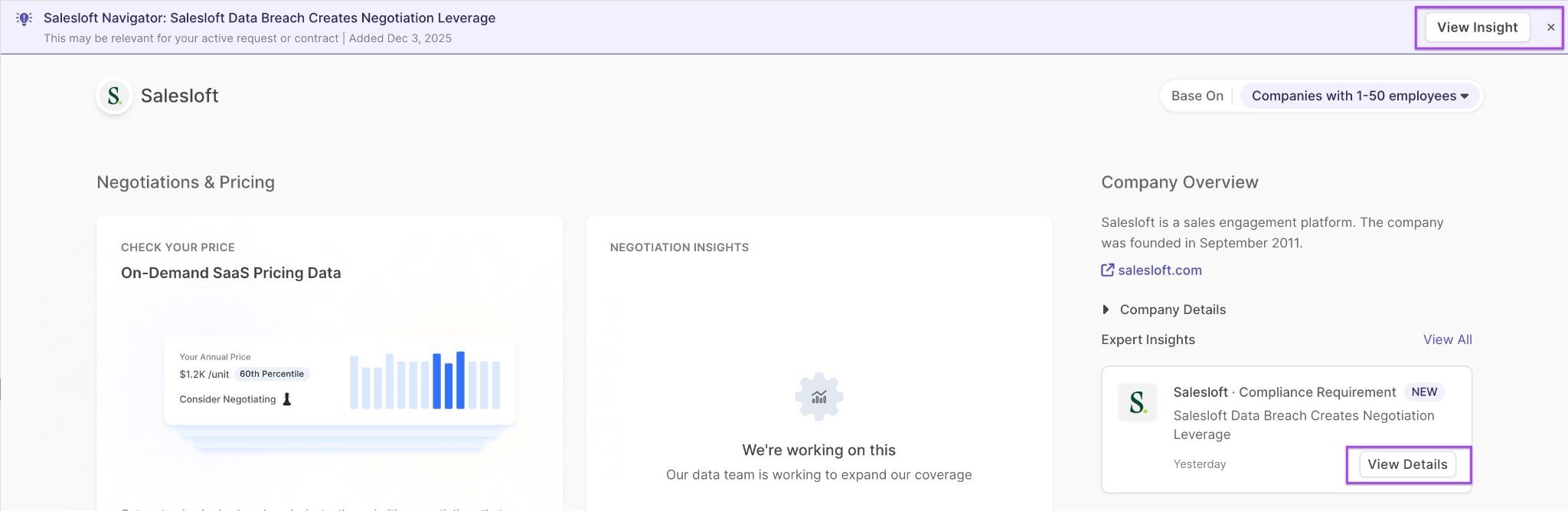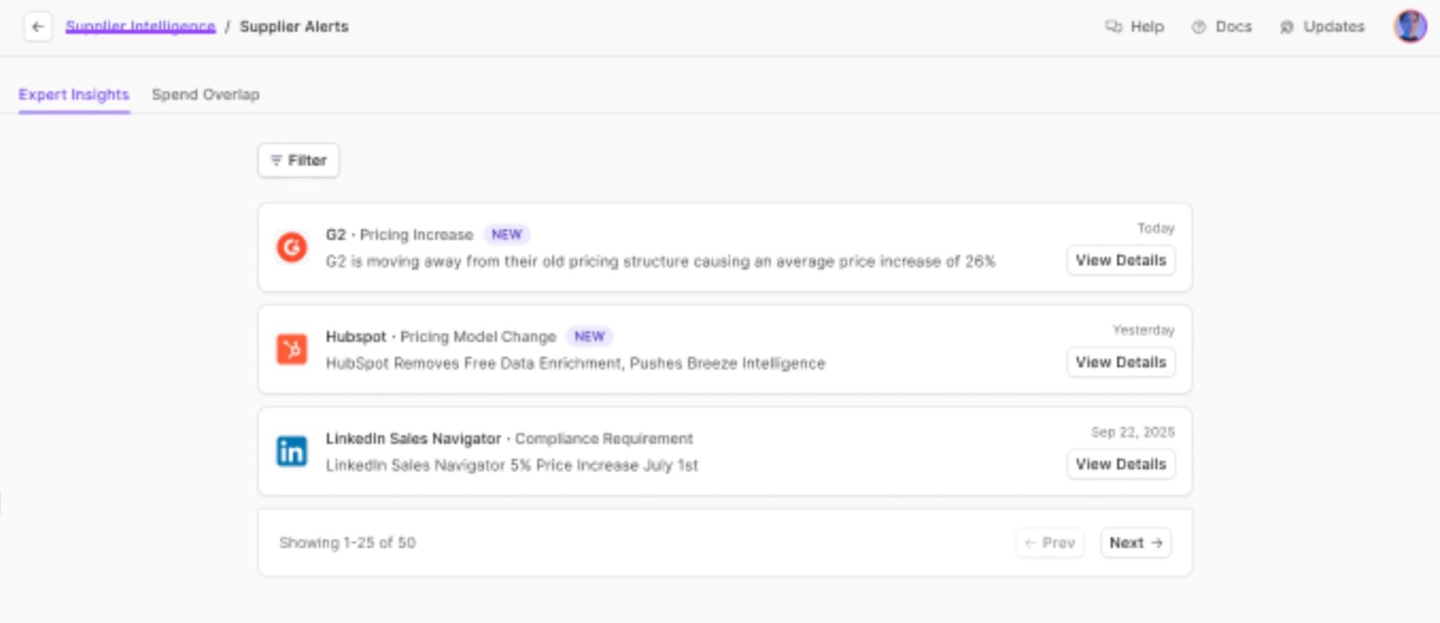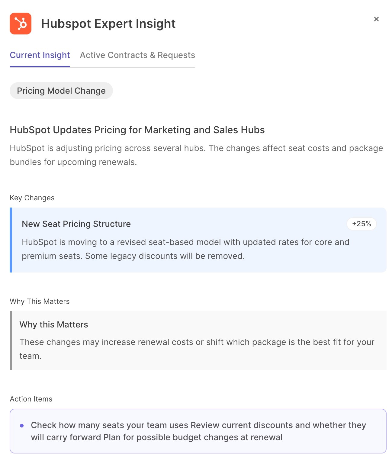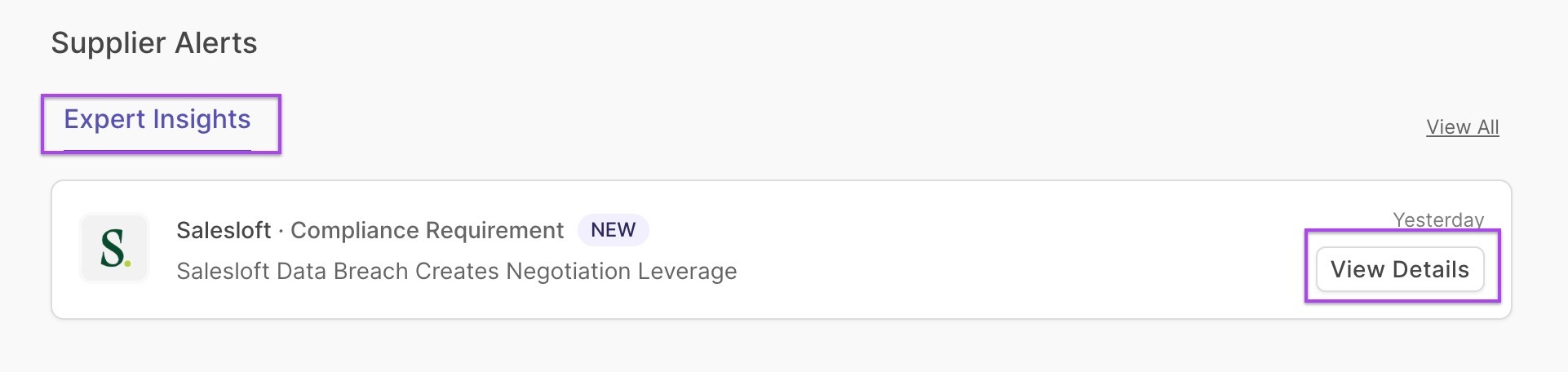 Expert Insights help you understand how a supplier change might impact your renewal, budget, or ongoing work. You can review the summary, see what changed, and use that information to plan next steps with confidence.