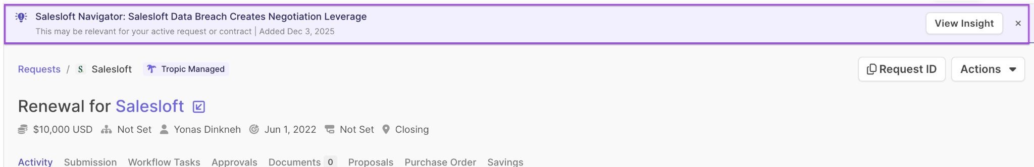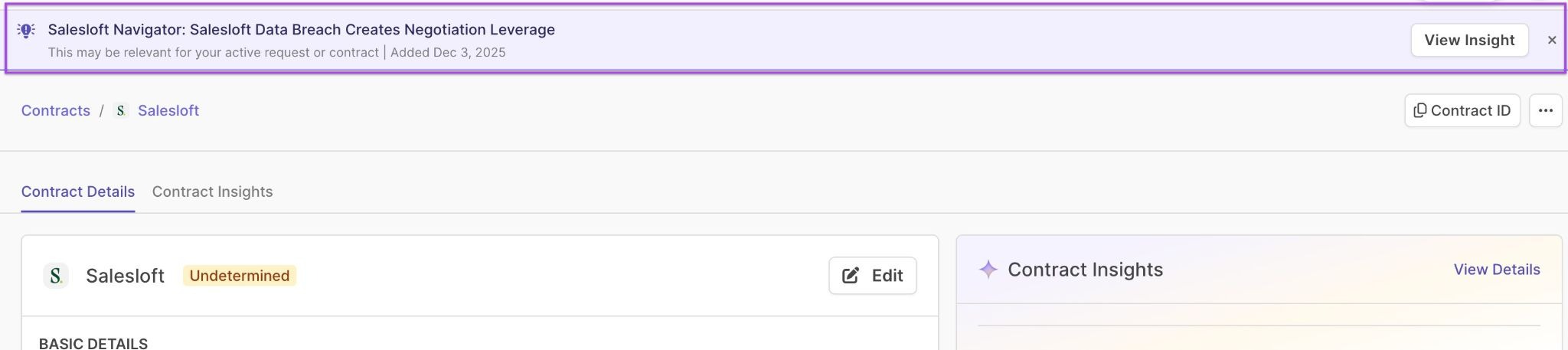 If there is an active insight for the supplier, a banner appears at the top of the page. This lets you open the full insight while you review the contract or request.