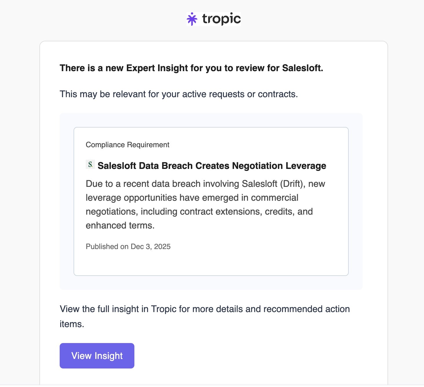 When a new Expert Insight is published, Tropic sends an email to anyone who is a contract owner on an active contract or a requestor on an active request for that supplier. The email shows the insight headline and a summary. Select View Insight to open it directly in Tropic.