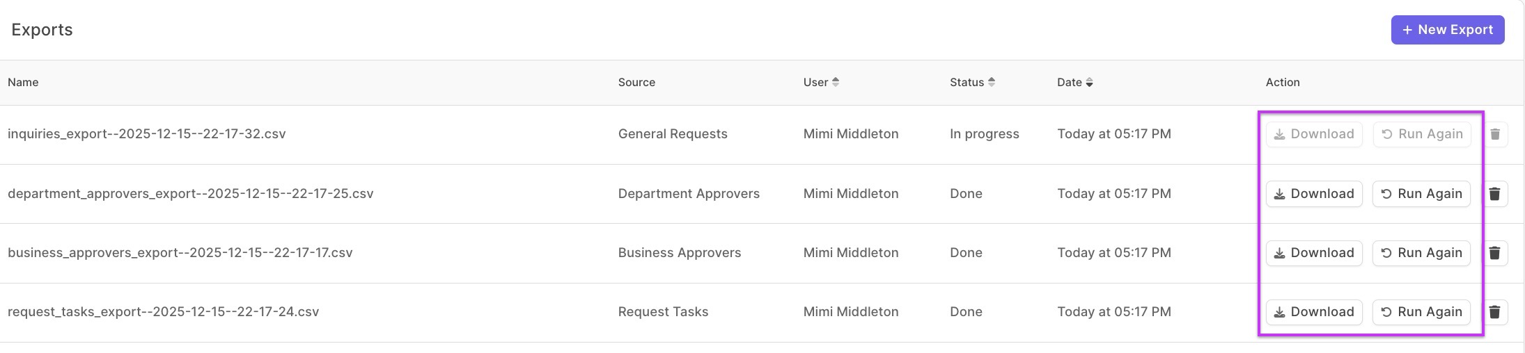 - Click Download to download the export as a CSV file. Click Run Again to repeat the export.