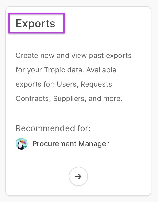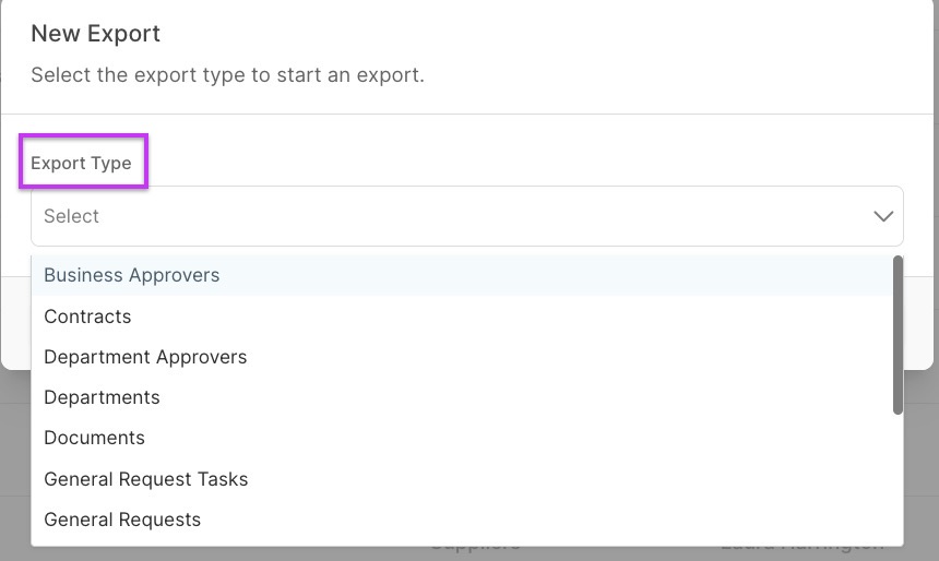 The Exports page is where you manage all exports for your organization. You can start exports directly from the page you are viewing, such as Contracts, Suppliers, or Requests. When you do this, the export appears on the Exports page right away so you can download it or re-run it. You can also start a new export directly from the Exports page. Only Organization Owners can use this feature.