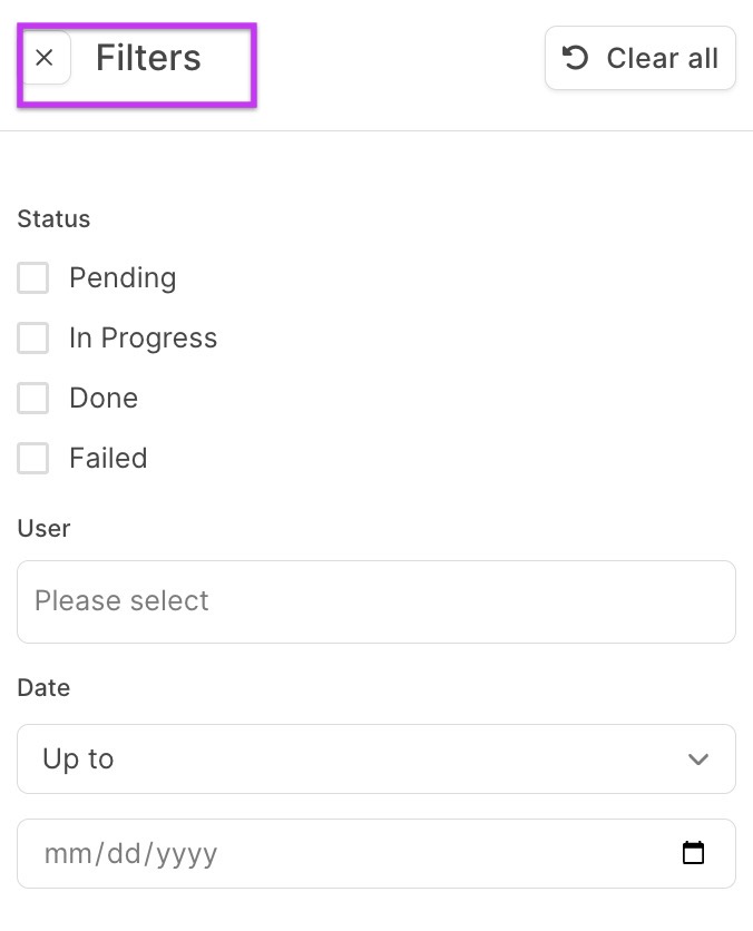 - You can filter exports by Source, Status, or Date to find what you need.